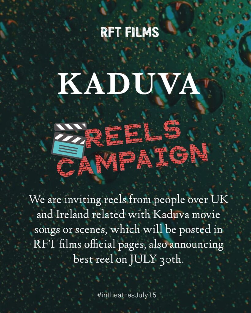 കടുവ സിനിമയുടെ പ്രൊമോഷന്റെ ഭാഗമായി കടുവ റീൽ കാമ്പയിൻ RFT ഫിലിംസ് അവരുടെ സോഷ്യൽ മീഡിയ പേജുകളിൽ നടത്തി വരുന്നു, അതിനും മികച്ച പങ്കാളിത്തമാണ് കാണാൻ സാധിക്കുന്നത്.