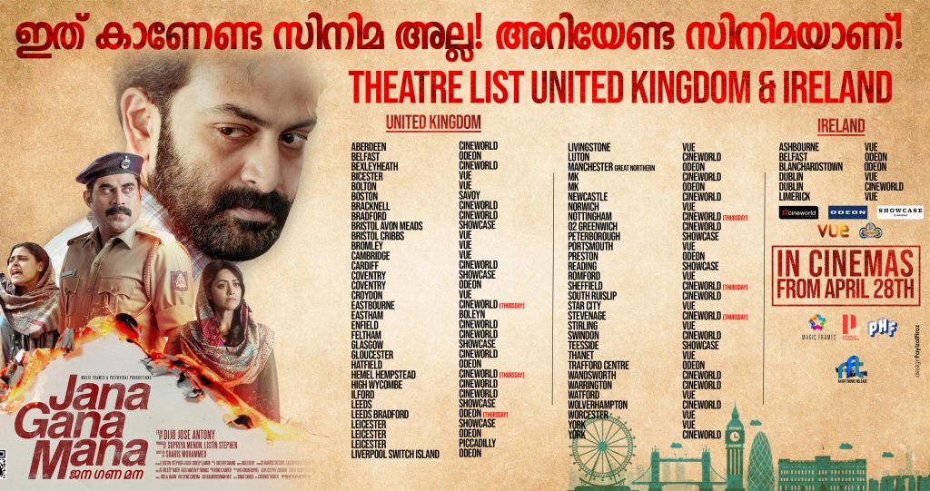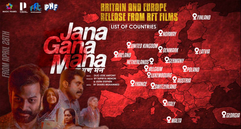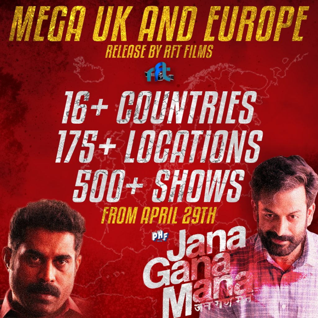 17 ൽ പരം രാജ്യങ്ങൾ.. 175 ൽ അധികം സ്ഥലങ്ങളിൽ.. 500 ൽ അധികം ഷോ.. അങ്ങനെ നിരവധി ചരിത്രം കുറിക്കുകയാണ് ജന ഗണ മന യുടെ വമ്പൻ റിലീസിൽ RFT ഫിലിംസ്…