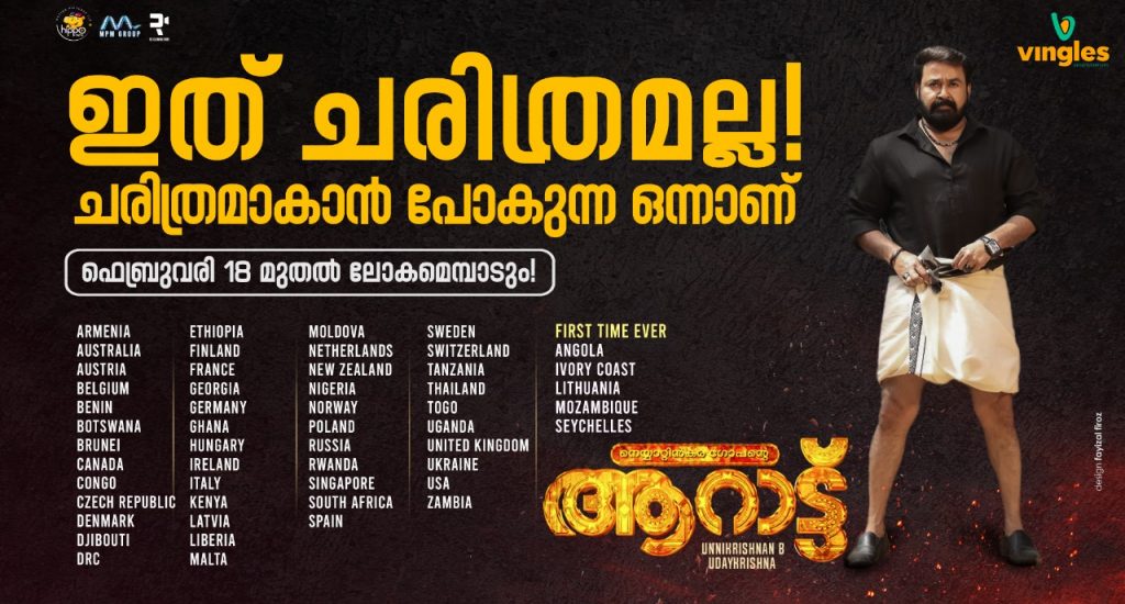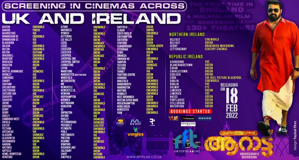 ലണ്ടൻ: ഏറെ നാളത്തെ കാത്തിരിപ്പിന് വിരാമം ആയിരിക്കുന്നു.. മോഹൻലാൽ ആരാധകർക്ക് ഈ വർഷത്തെ ആഘോഷങ്ങൾക്ക് നാളെ ലോകമെമ്പാടുമുള്ള തീയേറ്ററുകളിൽ കൊടിയേറും.. അതെ വളരെ പ്രതീക്ഷയോടെ മലയാളികൾ കാത്തിരുന്ന ആറാട്ട് നാളെ തീയേറ്റർ റിലീസിന് ഒരുങ്ങുന്നു.. GCC രാജ്യങ്ങൾ ഒഴികെ മറ്റ് അമ്പത്തി അഞ്ചിൽ പരം രാജ്യങ്ങളിൽ VINGLES ENTERTAINMENT ചിത്രം എത്തിക്കുന്നു.. യുകെയിലും IRELAND ലും പതിവ് പോലെ RFT ഫിലിംസ് ആണ് പ്രേക്ഷകരിലേക്ക് ആറാട്ട് എത്തിക്കുന്നത് ഇംഗ്ലണ്ടിന് ഇത് ചരിത്ര നേട്ടമാണ് എന്ന് അവകാശപ്പെടാൻ പല കാരണങ്ങളുണ്ട് മലയാള സിനിമ ചരിത്രത്തിൽ ആദ്യമായി ആണ് ഒരു മലയാള സിനിമ ഇംഗ്ലണ്ടിൽ 130 ൽ പരം തീയേറ്ററുകളിൽ എത്തുന്നത്.. ഇംഗ്ലണ്ടിലെ മോഹൻലാൽ ഫാൻസ് അസോസിയേഷൻ വീണ്ടും പുന സംഘടിപ്പിക്കുകയും ആറാട്ട് സിനിമക്ക് വമ്പൻ വരവേൽപാണ് റിലീസിന് മുൻപ് തന്നെ ഒരുക്കിയിരിക്കുന്നത് അതിൻ്റെ ഉദാഹരണമാണ് UK മോഹൻലാൽ ഫാൻസ് നിർമിച്ച ഫാൻ MADE പോസ്റ്ററുകളും ടീസറുകളും.. ഇപ്പൊൾ തന്നെ യുകെയിലെ മിക്ക സ്ക്രീനുകളിലും ആദ്യ ആഴ്ച്ചയിലെ ബുക്കിംഗ് ചൂടപ്പം പോലെ വിറ്റ് പോകുന്നു.. ആദ്യ ഒരാഴ്ച മറ്റൊരു ചരിത്രം കൂടി RFT ഫിലിംസ് അവകാശപ്പെടുന്നു ആദ്യമായി ഒരു ആഴ്ചയിൽ 508+ ഷോ ഓടുന്ന മലയാളം സിനിമ എന്ന റെക്കോർഡും ഇനി ആറാട്ടിന് സ്വന്തം…