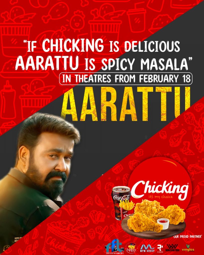 ആറാട്ട് സിനിമയുടെ UK EUROPE പ്രമോഷനു ലോകത്തിലെ തന്നെ ഏറ്റവും വലിയ ഫ്രൈഡ് ചിക്കൻ ശൃംഖല ആയ ചിക്കിങ്ങും RFT ഫിലിംസിൻ്റെ കൂടെ അണിചേരുന്നു.. UK BBFC സെൺസറിങ് കഴിഞ്ഞപ്പോൾ ആറാട്ട് സിനിമക്ക് 12A അംഗീകൃതമായത് കൂടുതൽ കുടുംബ പ്രേക്ഷകരെ തീയേറ്ററിലേക്ക് എത്തിക്കാൻ കാരണമായി.. ഏതായാലും നെയ്യാറ്റിൻകര ഗോപൻ്റെ ആറാട്ട് ഇംഗ്ലണ്ടിലെ ജന ഹൃദ്ധയങ്ങൾ കീഴടക്കും എന്നുള്ളത് ഉറപ്പാണ്..