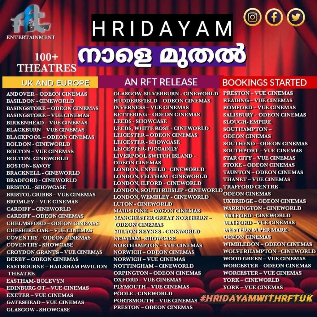 100+ THEATRES FOR HRIDAYAM IN ENGLAND