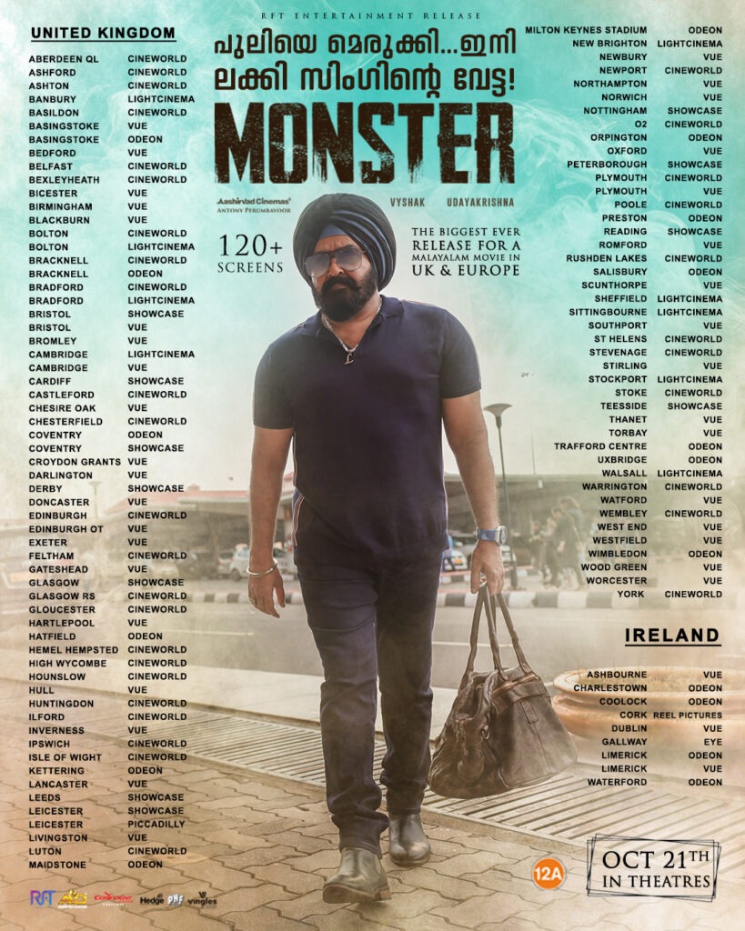 തിയറ്ററുകളില് ആഘോഷമായി മോഹന്ലാല് നായകനായെത്തിയ ചിത്രം മോണ്സ്റ്റര്. റിലീസായി രണ്ടാം ദിനവും ഹൗസ്ഫുള് ഷോകളുമായാണ് മോണ്സ്റ്റര് തേരോട്ടം തുടരുന്നത്. ഒടിടി ചിത്രമായി ഒരുങ്ങി പിന്നീട് തിയറ്റുകളിലേക്കെത്തിയ സിനിമയെ പ്രേക്ഷകരും ആരാധകരും ഇരുകയ്യും നീട്ടിയാണ് ഏറ്റെടുത്തിരിക്കുന്നത്. ഇതുവരെ മലയാളത്തില് അവതരിപ്പിക്കാത്ത വിധത്തിലുള്ളൊരു കഥയെ ഏറെ മികച്ച രീതിയില് സംവിധായകന് ഒരുക്കിയിട്ടുണ്ടെന്ന് കണ്ടിറങ്ങുന്നവര് ഒരേ സ്വരത്തില് പറയുന്നു. സര്ദാര് ലുക്കിലുള്ള മോഹന്ലാല് പ്രേക്ഷകരുടെ മനസില് ഇടം നേടികഴിഞ്ഞു. ഇരിപ്പും നടപ്പും കുസൃതി ചിരികളും രസികന് വര്ത്തമാനങ്ങളും ചില ദുരൂഹമായ നോട്ടങ്ങളുമായി കേരളക്കര മുഴുവന് ലക്കി സിങ് തരംഗമാണ്.